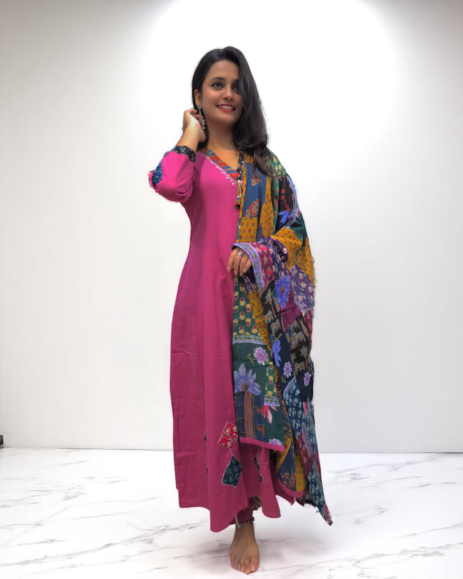 The Anarkali Suit Patch Work in Pink is thoughtfully made from flex cotton to provide a comfortable and stylish fit. Its light and breathable fabric is perfect for staying cool during summer or at the office. The suit is complemented by a beautiful contrast dupatta decorated with several printed patches, giving it a special and graceful look. This design is ideal for anyone looking for a blend of comfort and unique elegance in their wardrobe.