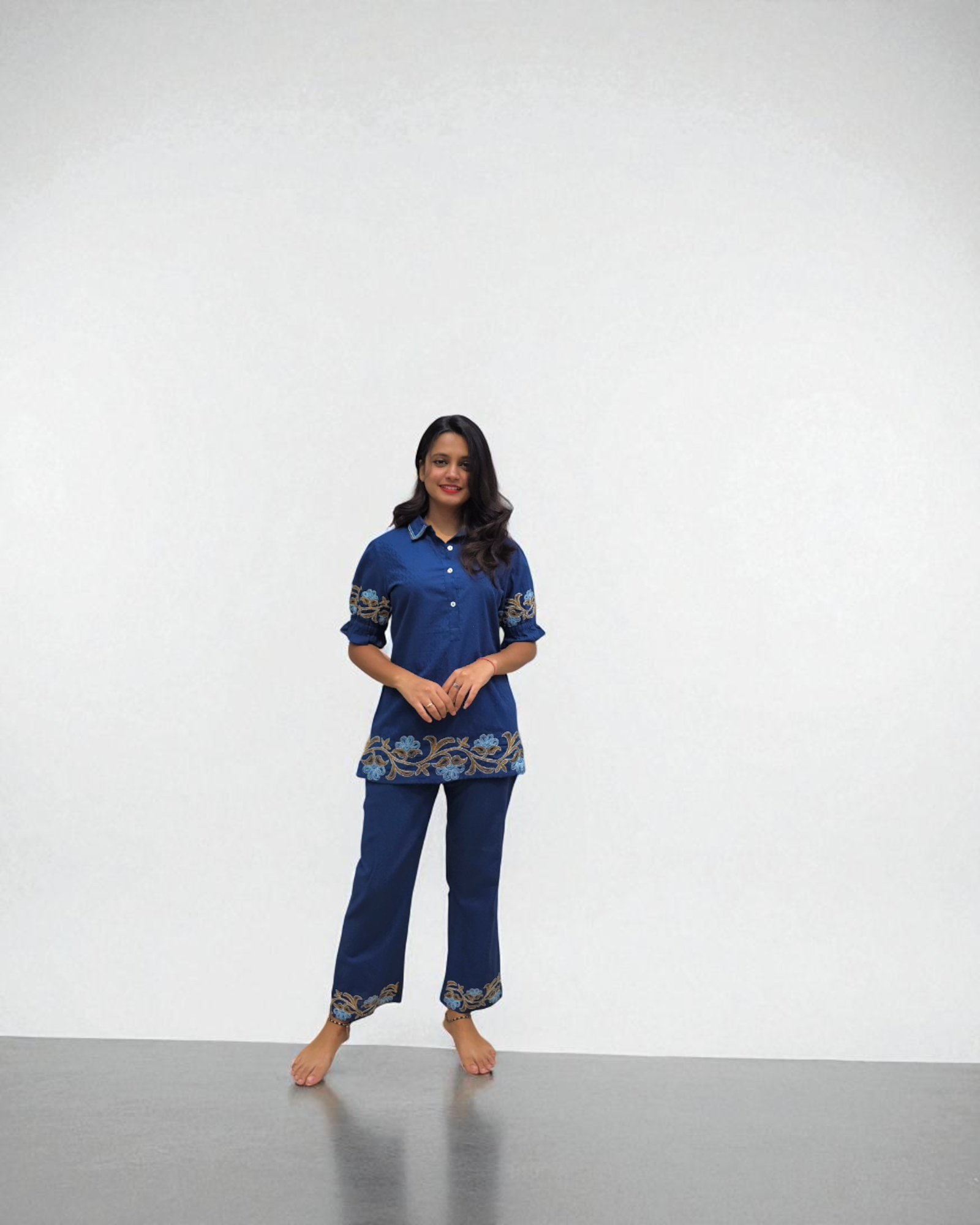 Step into elegance with this stunning Blue Embroidered Co-ord Set with Palazzo – a perfect fusion of comfort and ethnic charm. Crafted from premium fabric, this set features delicate embroidery work that adds a touch of grace and sophistication. The flowy palazzo pants ensure ease of movement, making it ideal for festive occasions, casual gatherings, or stylish day-outs.