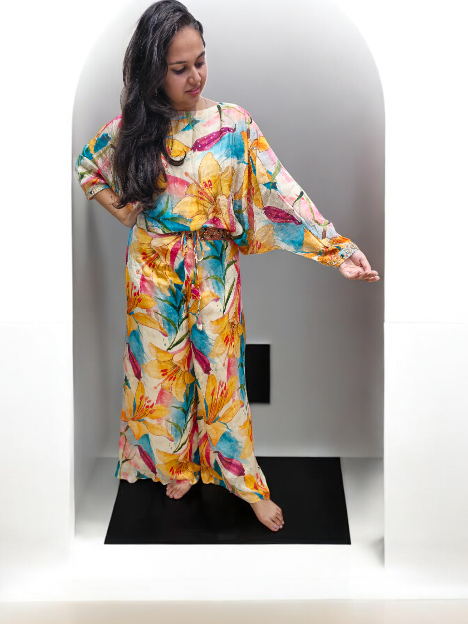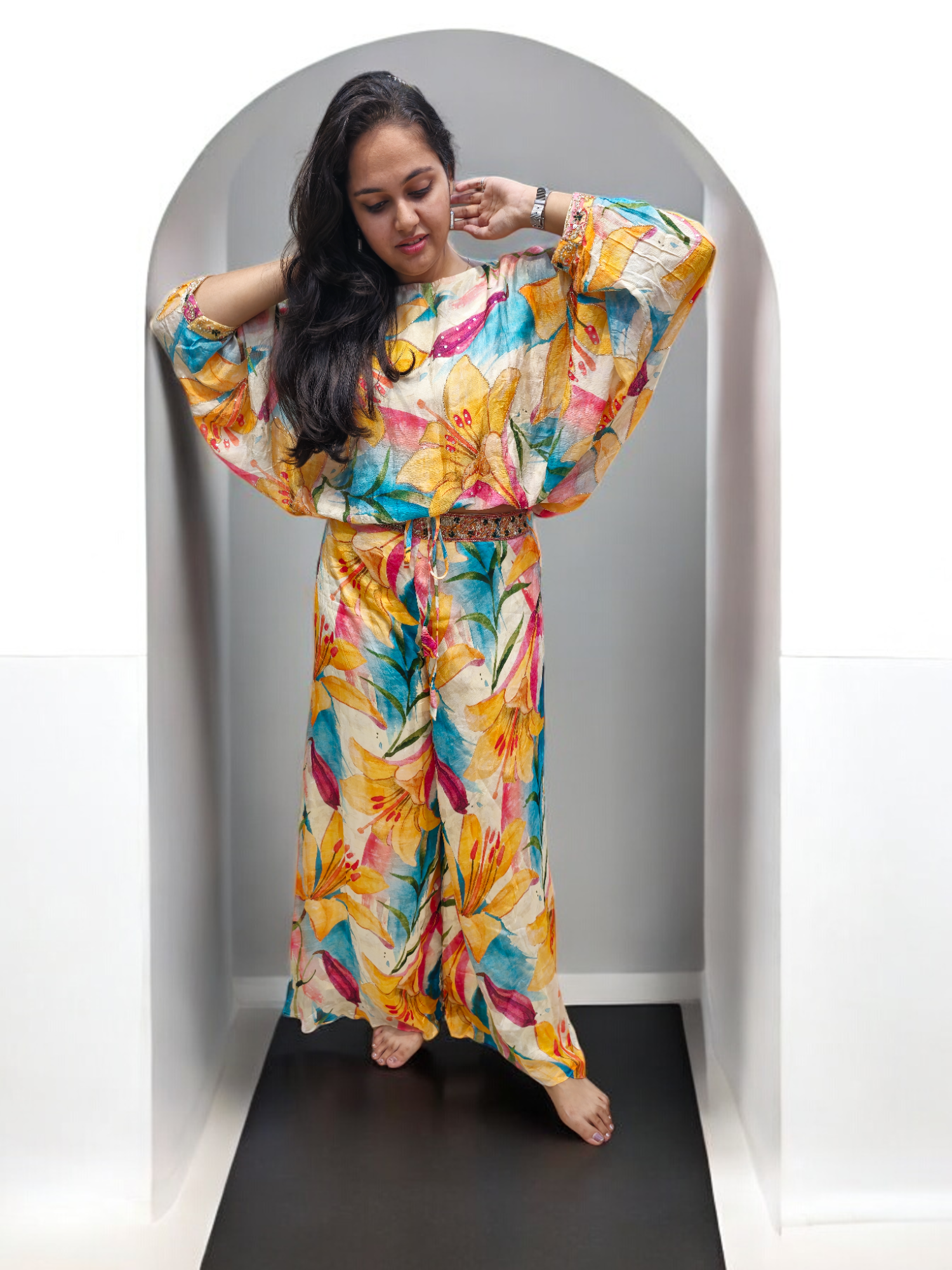 Expertly crafted from pure chinnon fabric, this Printed Multi-color Crop-top Plazzo features a stunning handwork design that adds a touch of elegance. The crop top plazzo style offers a comfortable fit, while the vibrant multi colors add a playful touch. Perfect for any occasion, this piece is sure to make a statement.
